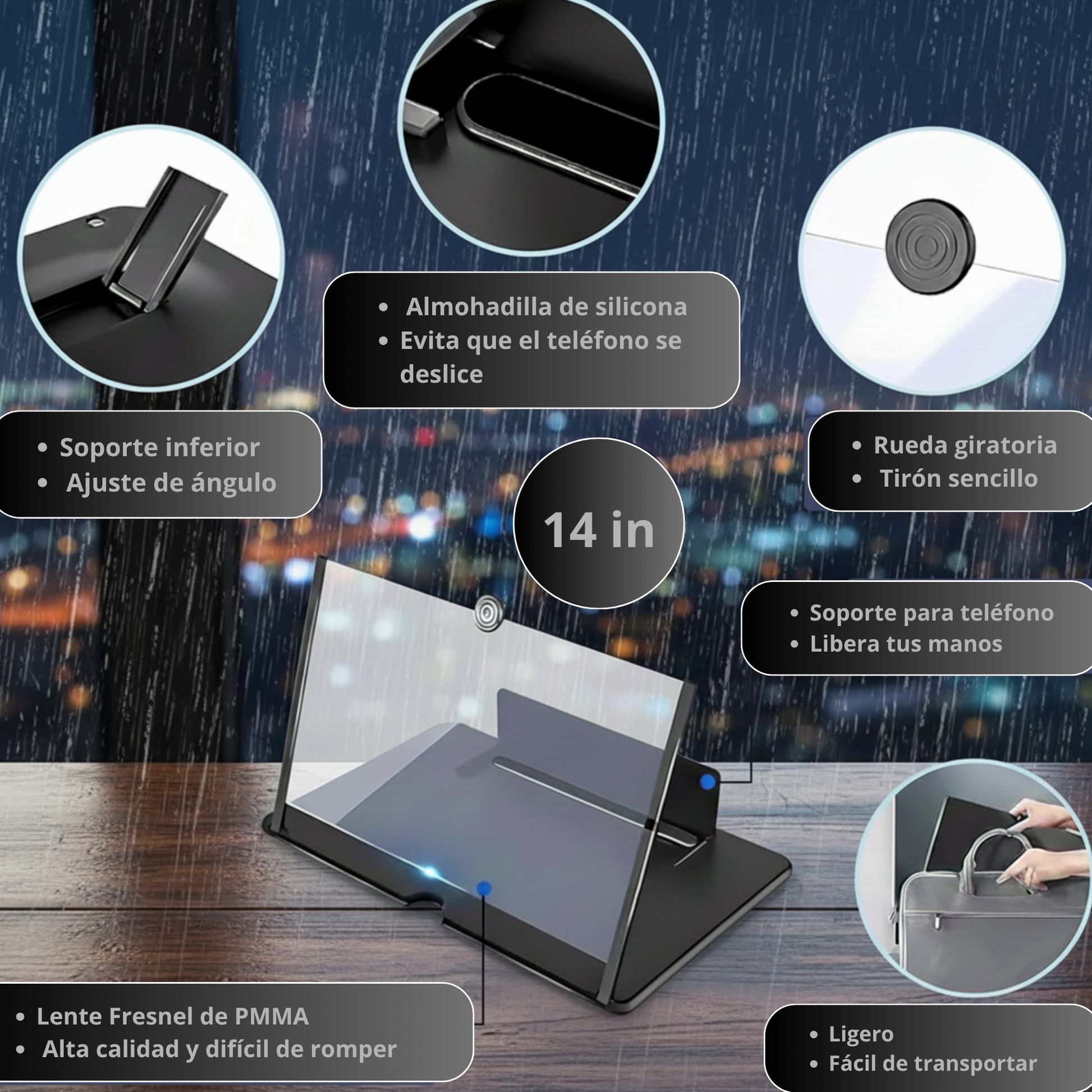 Gracias a su diseño ajustable, puedes colocar tu teléfono incluso si tiene funda protectora. La lente Fresnel garantiza una ampliación clara y nítida para cualquier dispositivo.